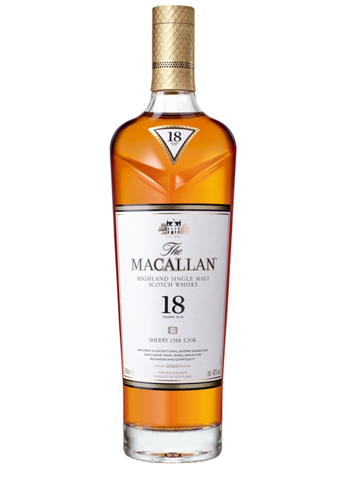 Macallan 18 Sherry is aged for 18 years, offering layered aromas of ripe pear, vanilla and light oak. A well-crafted whisky with a rounded palate, subtle sweetness and a clean finish. Enjoy neat, on ice, or in simple highballs.